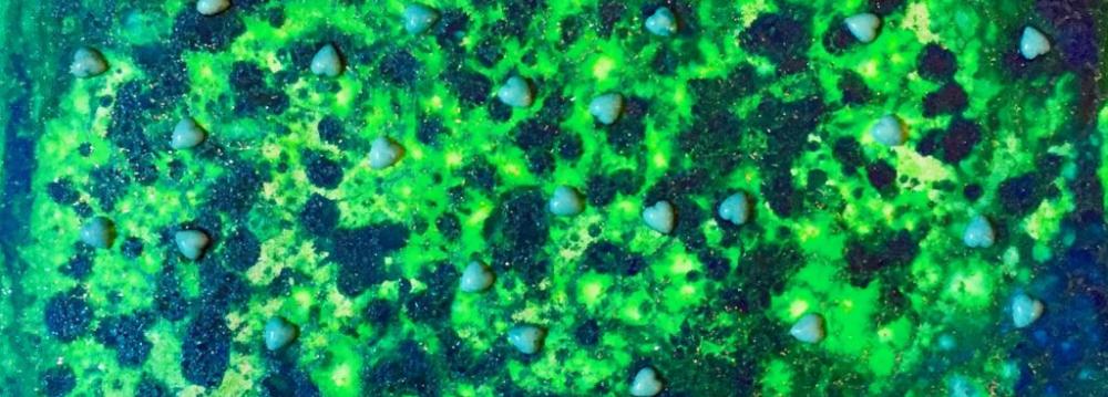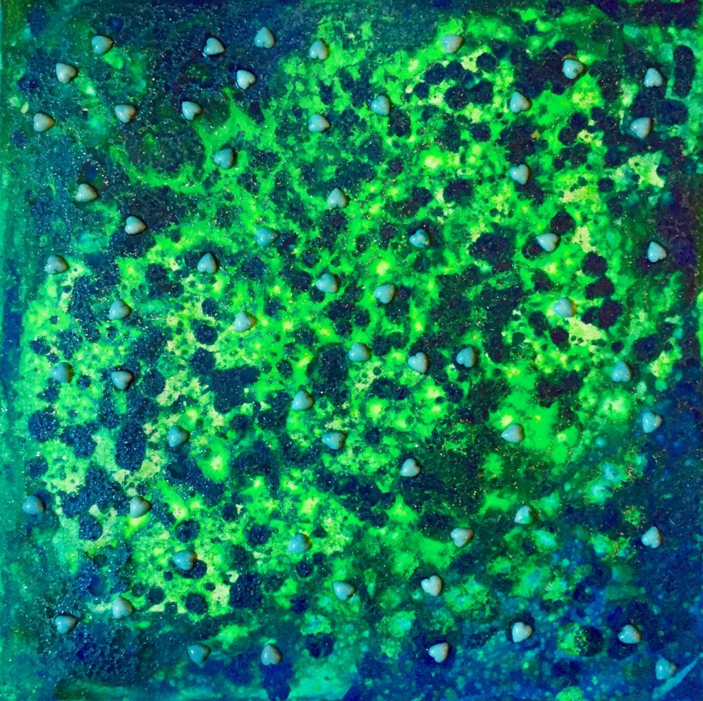 “The colors clearly represent the auroras over Iceland, and I added the hearts as symbolism for people looking for love; moving in all directions caught up in this powerful magnetic field,” the artist explained in a statement. “I chose the northern lights because of my connections to Iceland, and love for the beauty of that country.”