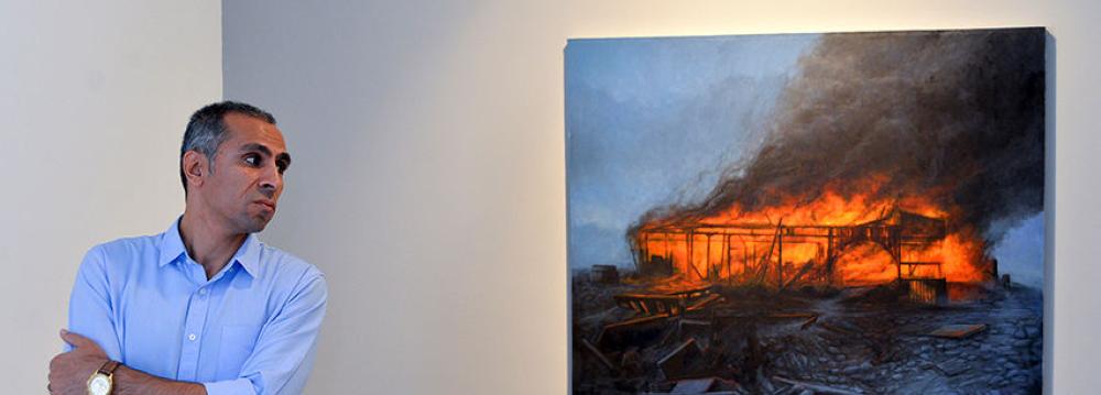 Houses on fire are the subject of a series of realist paintings by Ali-Akbar Jahangard. “If There Is a Home …” is Jahangard’s solo painting show underway at Sareban Art Gallery in Tehran till September 17, Iranian Visual Art News Agency reported. “Jahangard’s paintings are inspired by his hometown Qasr-Shirin (in Kermanshah). The motif of fire is used symbolically, and to me it seems that the paintings describe the present social conditions,” said painter and instructor Iraj Eskandari, who attended the opening ceremony of the exhibition on September 7.