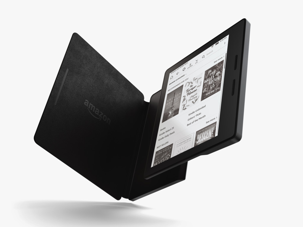 The book-style cover utilizes a dozen magnets to keep the lid closed while not in use. The cover also features an integrated battery that brings the Oasis’ total runtime up to eight weeks.