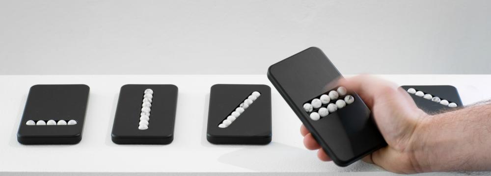 A designer sees his art piece -- plastic blocks embedded with stone beads -- as one answer to phone obsession.