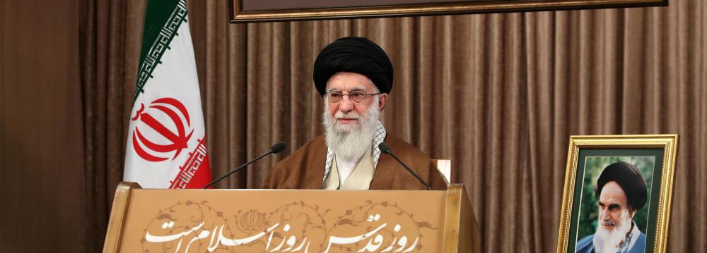 Ayatollah Khamenei addressed the nation in an online speech to commemorate International Quds Day marking the last Friday of the fasting month of Ramadan to pledge support to oppressed Palestinians in their decades-long struggle against the Israeli regime.