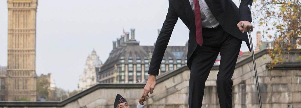 With a difference in height of almost 6.5 feet, the world’s tallest and shortest men met for the first time in London on Thursday.